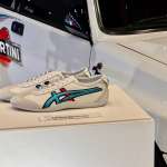 ▲Onitsuka Tigerは4台のクラシックカーの車体色に合わせたドライビングシューズを4色展示(販売未定)