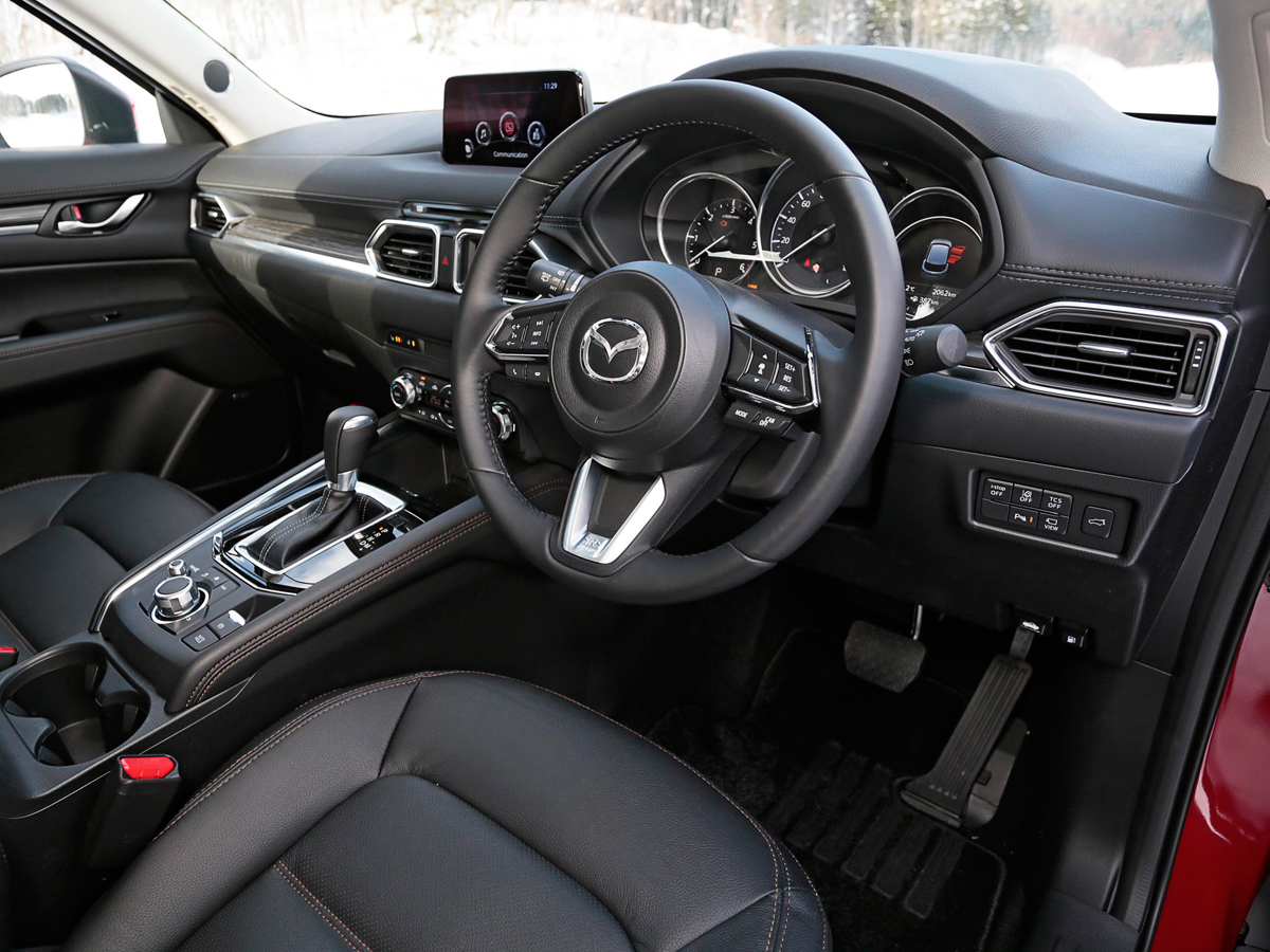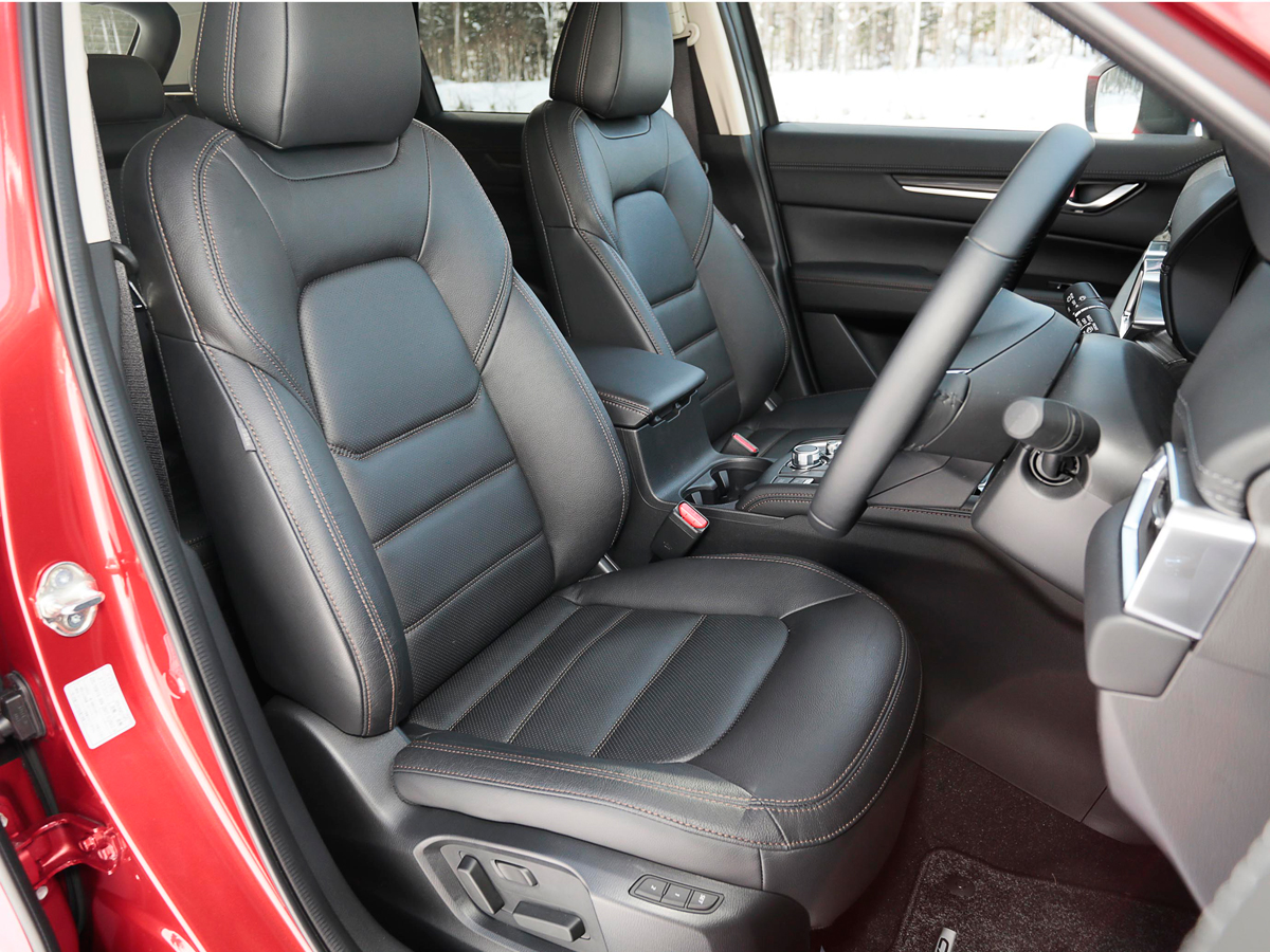 ザクザクと雪を踏みしめながら試乗車(量産前確認車)に近づき、クルマに乗り込んで、ステアリングホイールを握ったとたん「オオッ!」と驚きました。ハンドルのリムが温かい!! 今度のCX-5には、(グレードによって)ステアリングヒーターが装備されるのですね。「かつては豪華SUVの代名詞、レンジローバーならではの贅沢装備だったのに…」と、うれし涙で袖を濡らしました(やや誇張しております)。