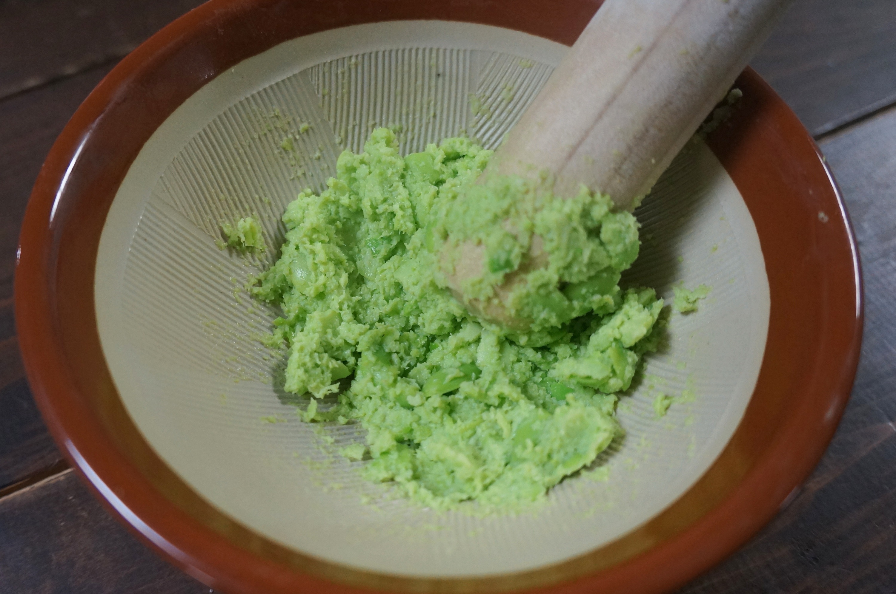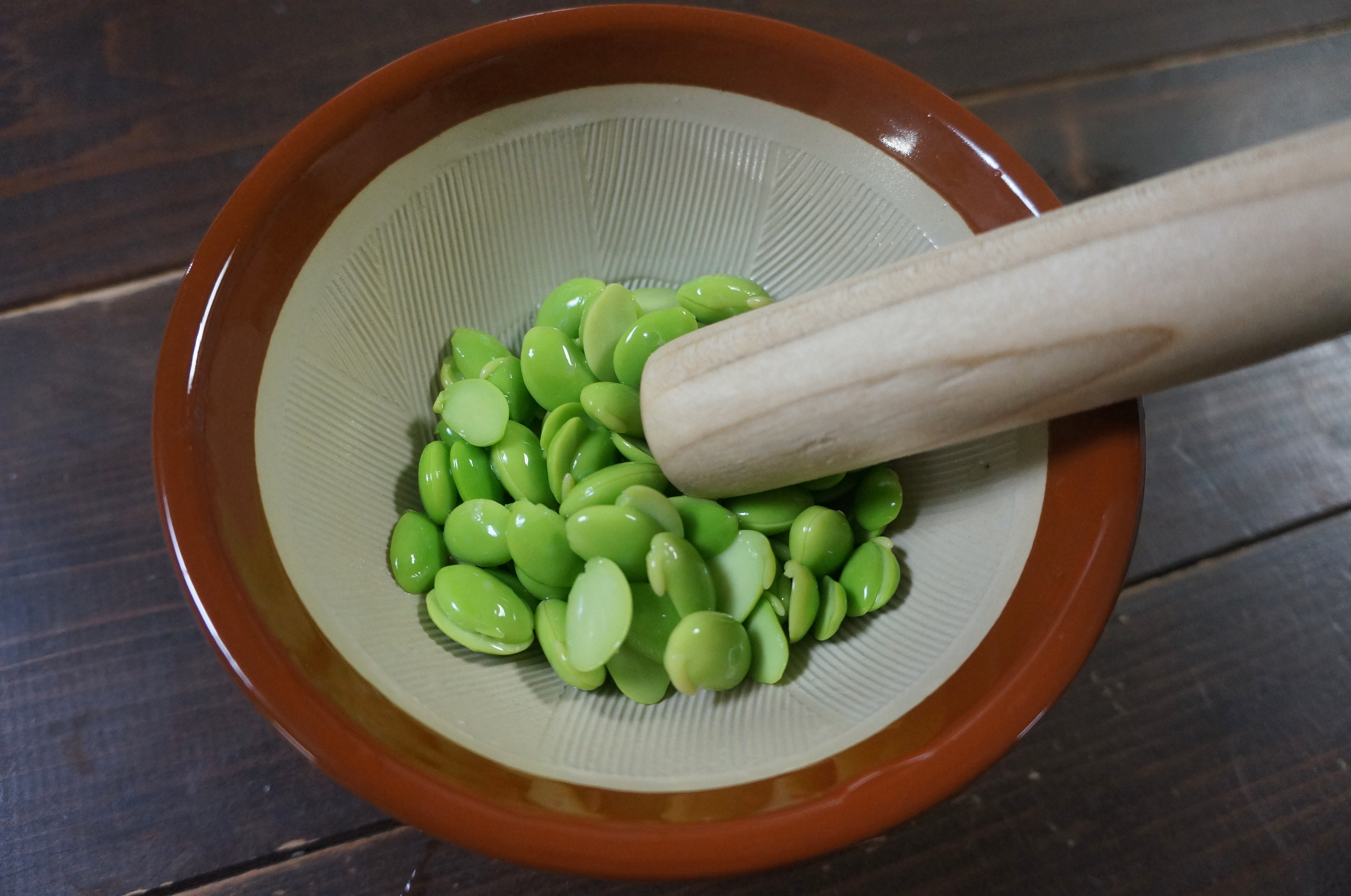 豆がペースト状になるまですり潰すのは、結構骨の折れる作業。筆者の感覚だと、すり鉢全体をかき回すのではなく、豆ひと粒ひと粒を押し潰すイメージですりこぎ棒を動かすと、うまくすり潰せた気がします。