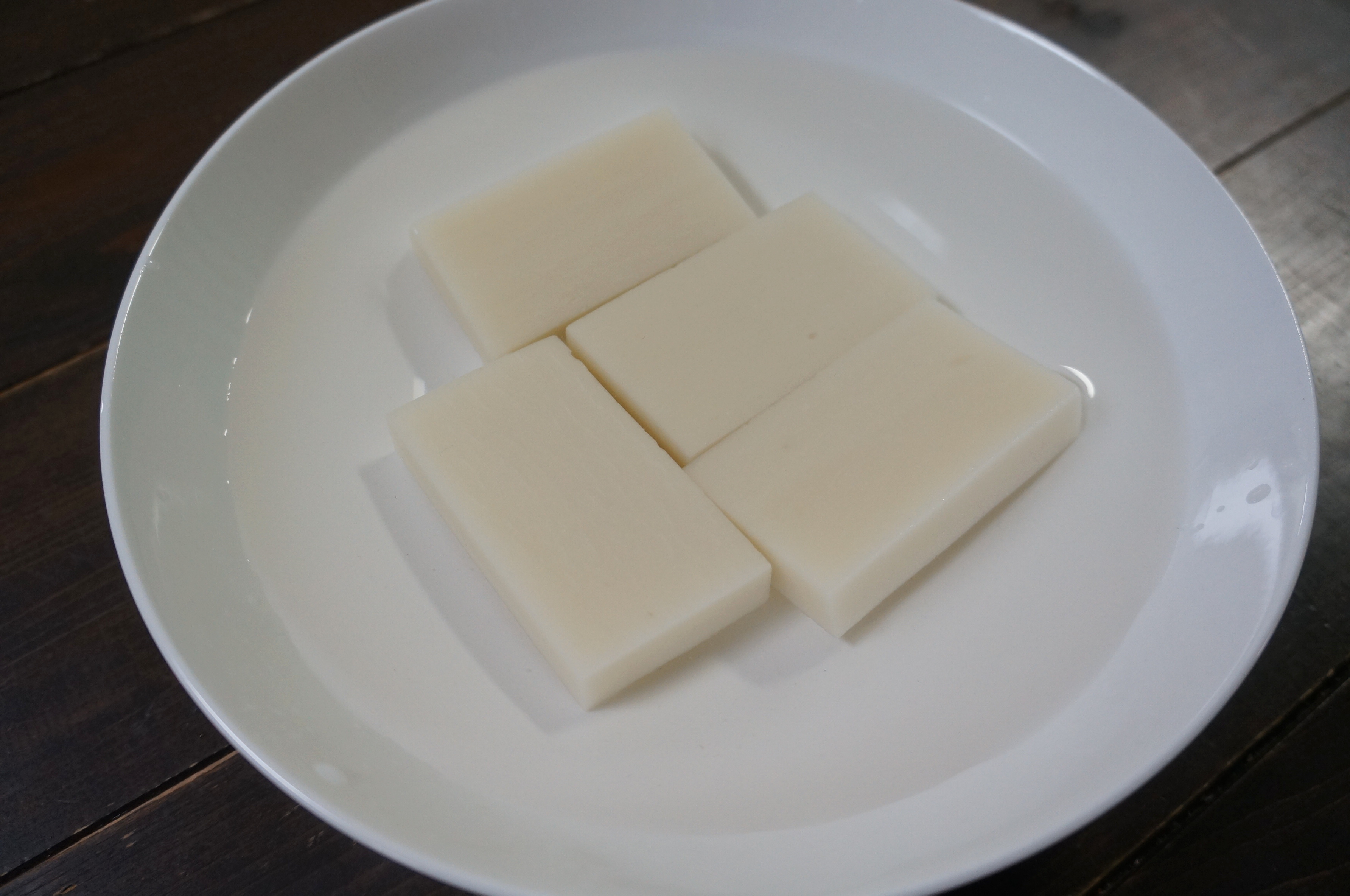 このくらい細かくすり潰せば、ずんだ餡はできあがりです。次に、土台となる餅を調理していきます。耐熱容器に餅を入れ、ひたひたになるくらい水を注いだらレンジで3~4分温めます。
