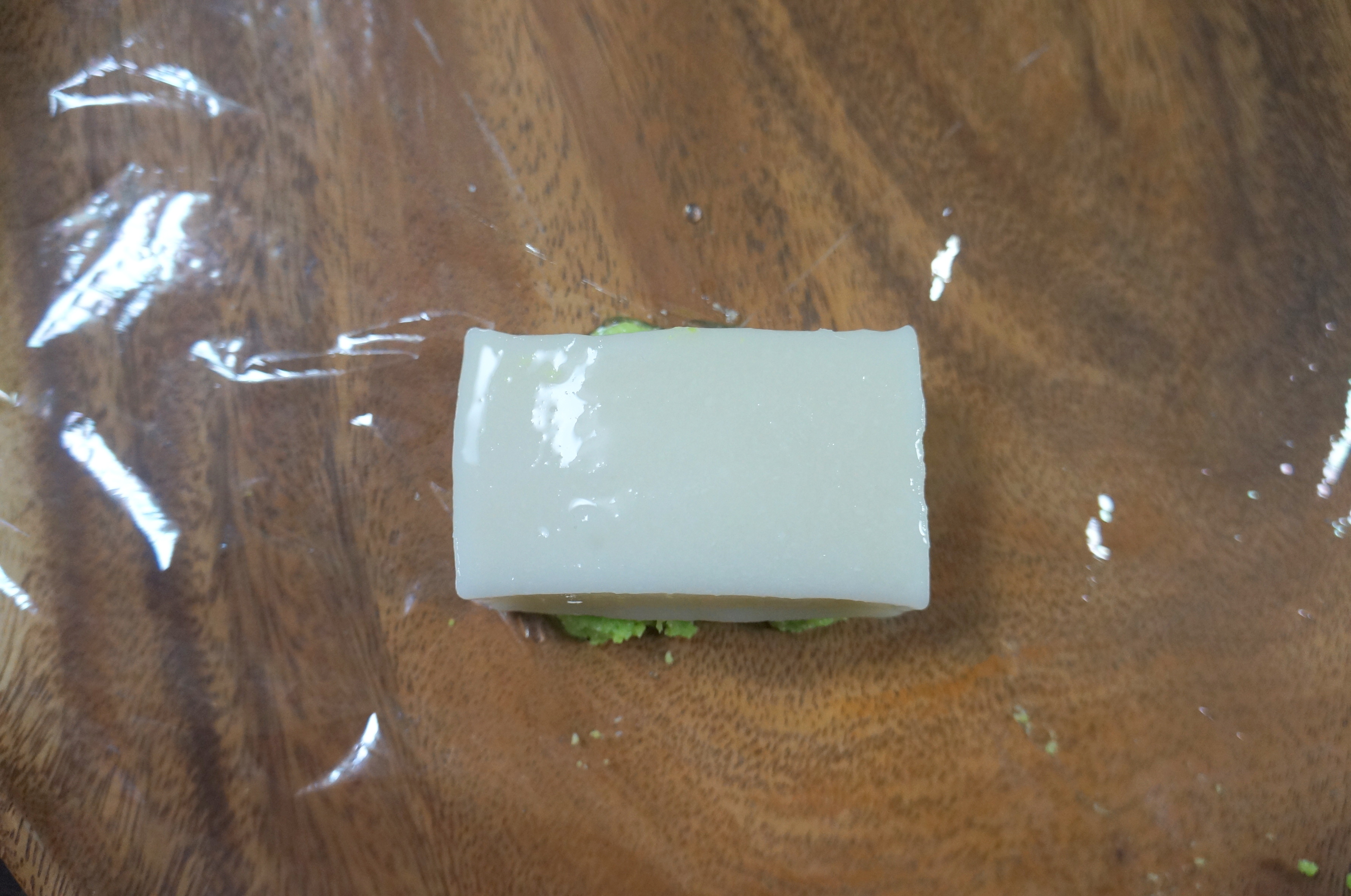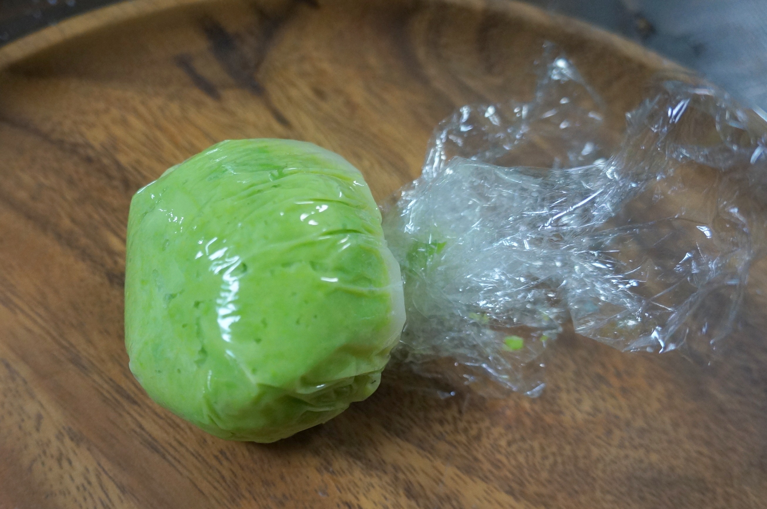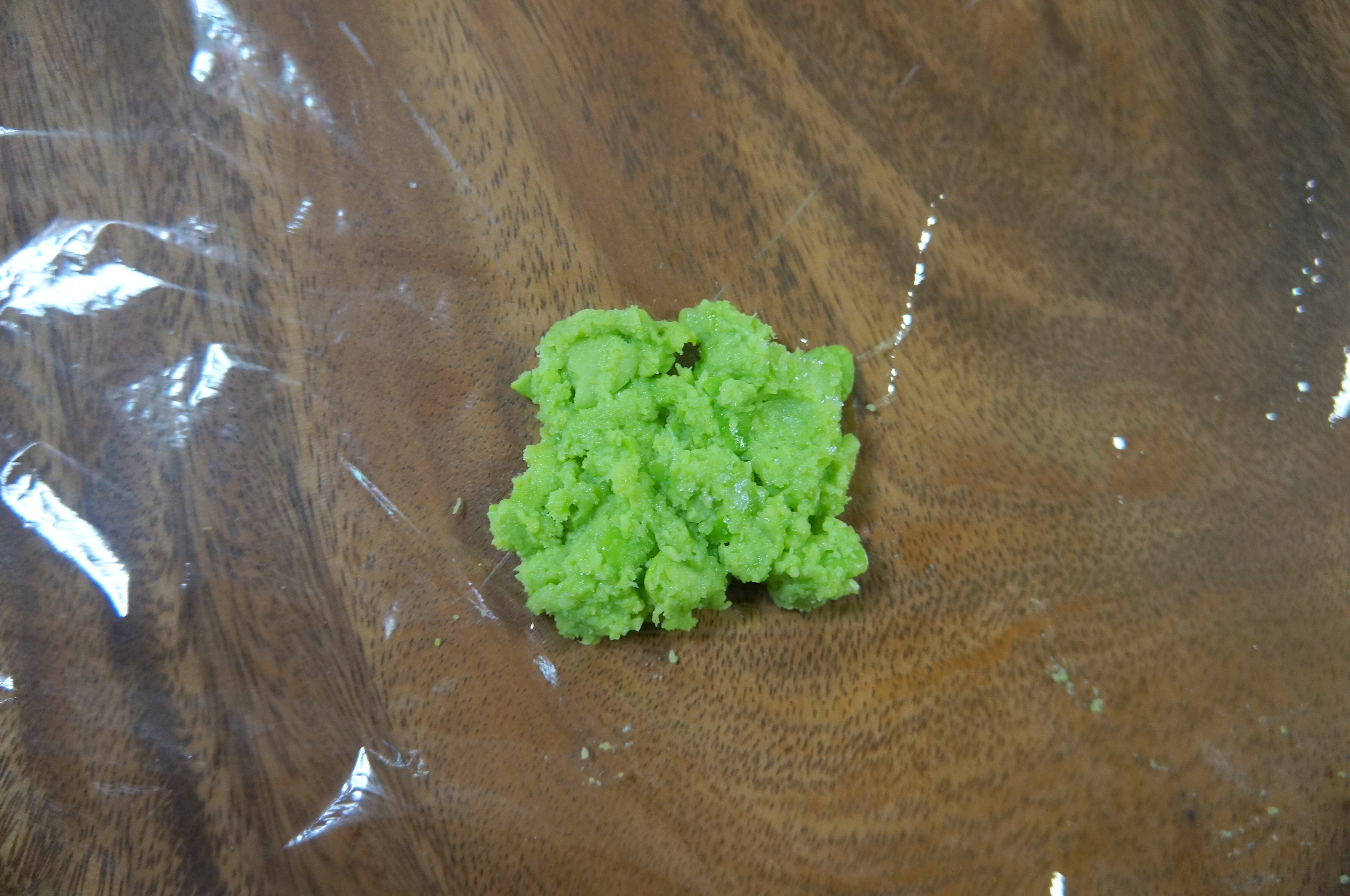 ここで、ずんだ餡を餅にきれいに “乗せる” 方法を紹介しましょう。まず、平らな場所にラップを敷き、その上にずんだ餡を広げます。