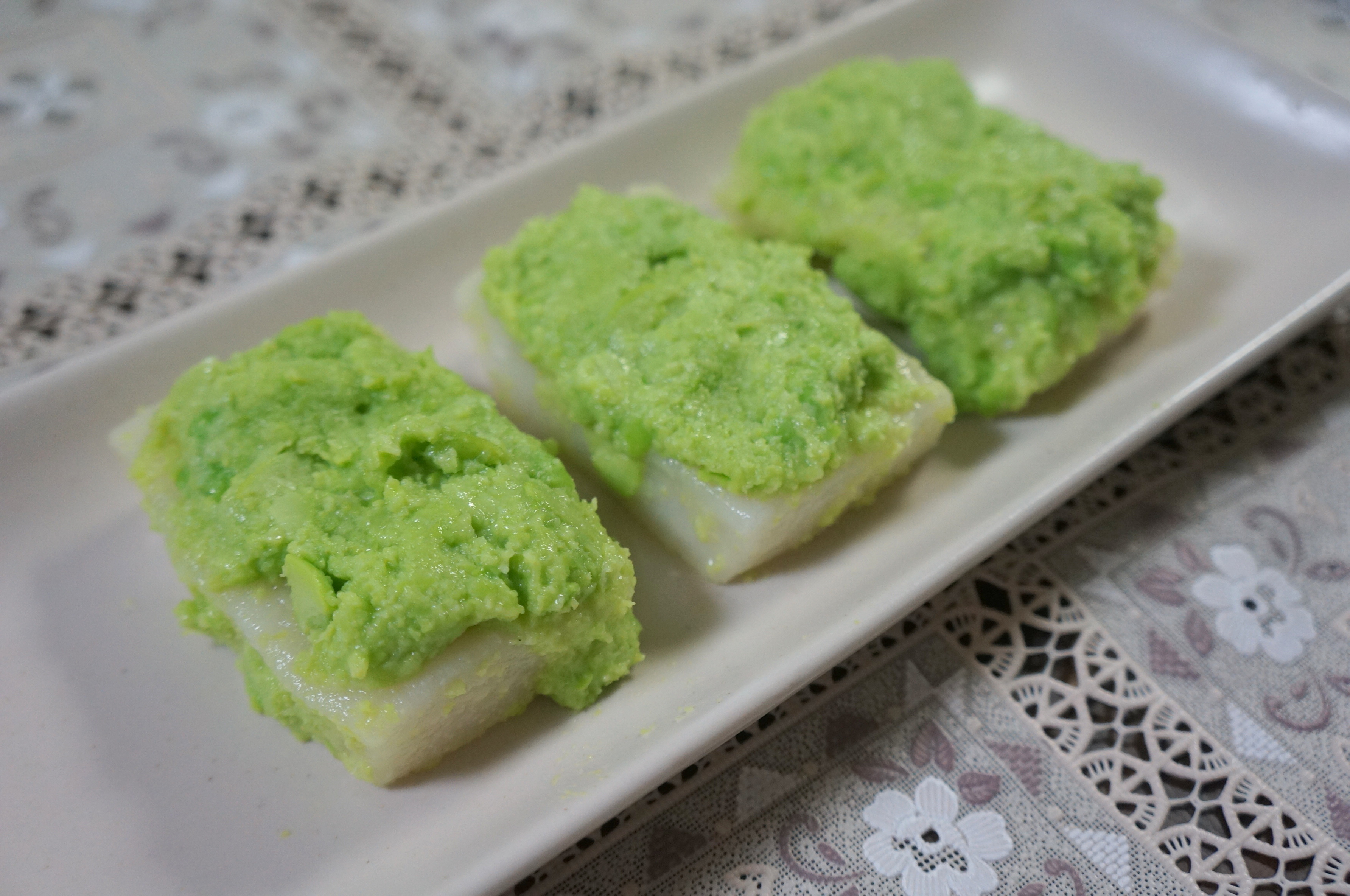 今回は4個のずんだ餅を作る予定でしたが、餅1個にたっぷりずんだ餡を乗せたため、3個になってしまいました…。
