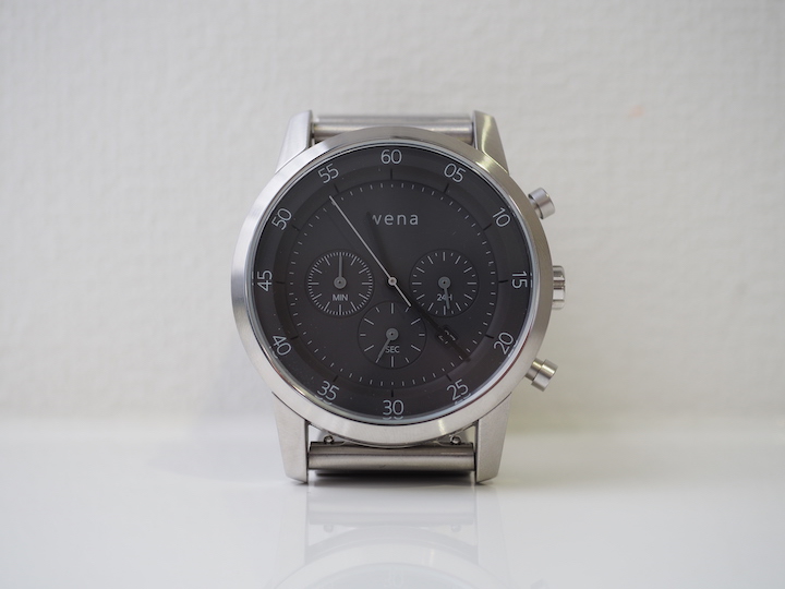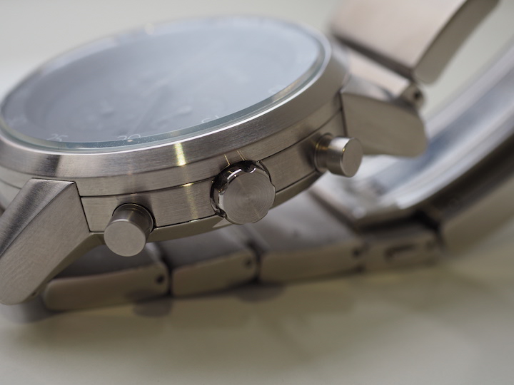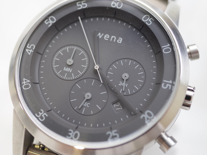 wena wristのWN-WC01S(クロノグラフモデル)は、良くも悪くも、まずは時計だ。初めて腕に載せた時の印象は、「重いな」というものだった。それはそうだ、筆者は腕時計しない歴20年くらいになる。今まで何も付けていなかった腕に、突然150g弱(149.1g)の重さが腕に掛かるのだから、気にならないわけがない。