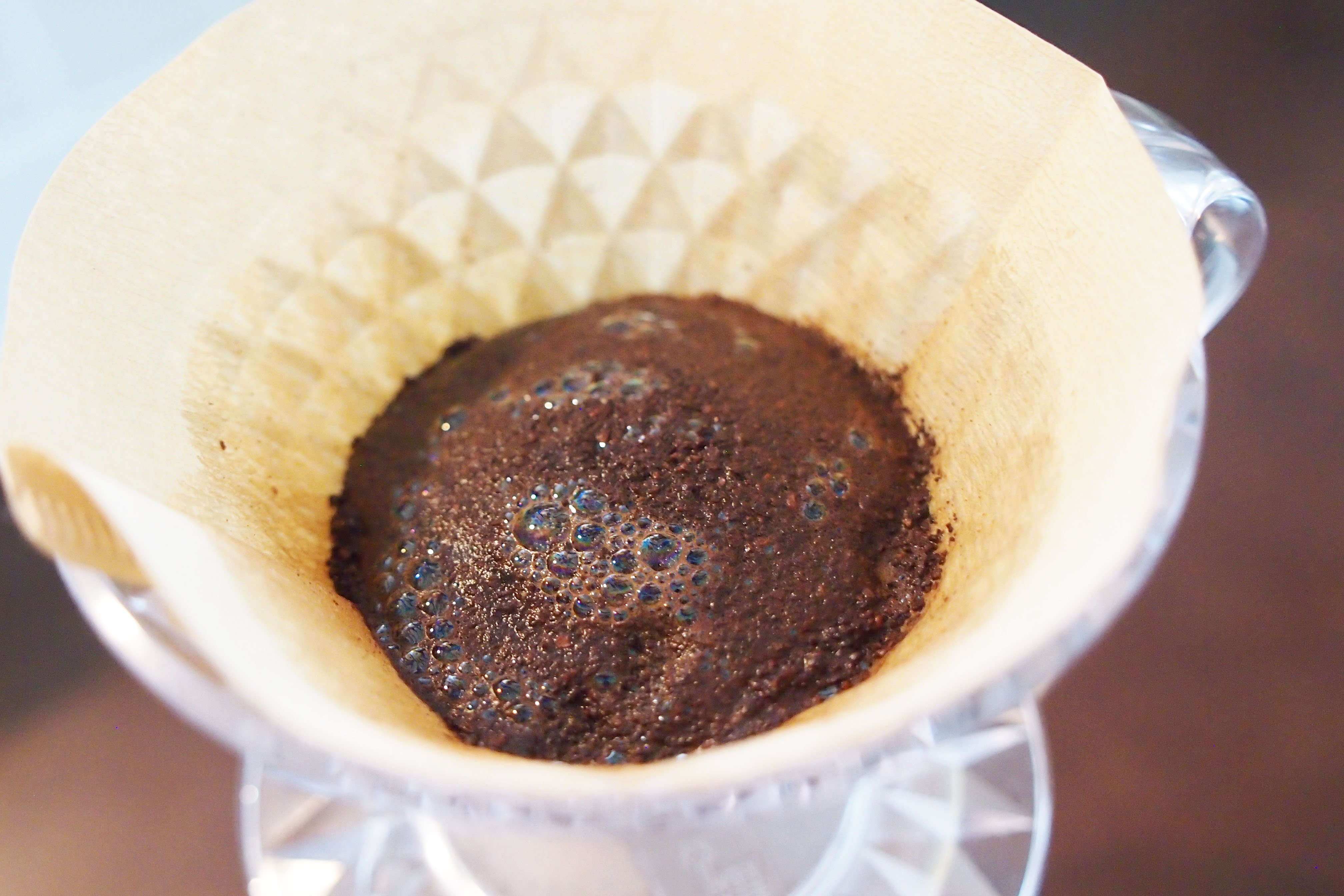 ▲最初に少量のお湯をまわしかけ、30秒ほど置いてガス抜きを行います。