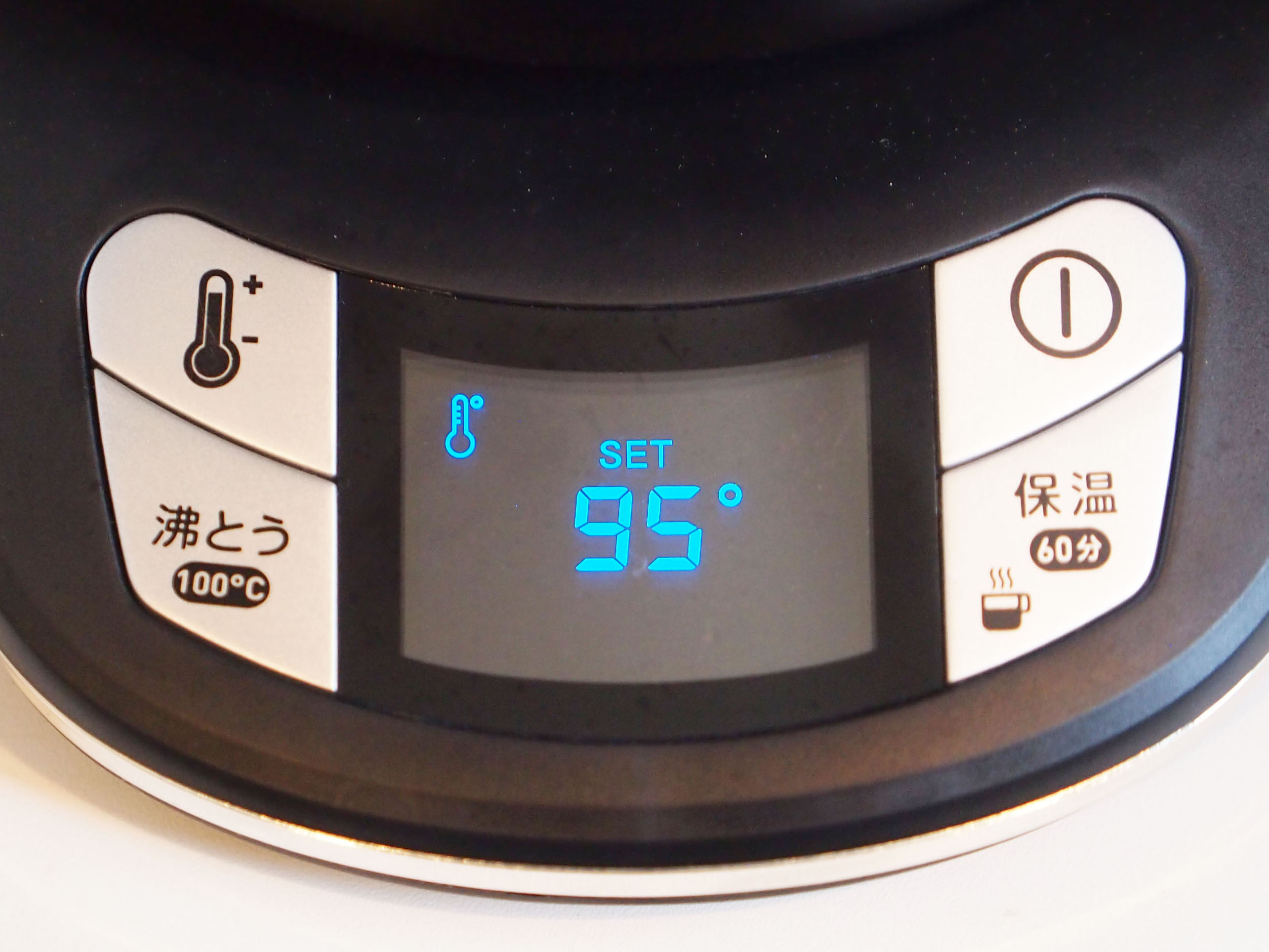 ▲左上のボタンを押して、温度設定を行います。95℃の表示で止めると、2度点滅し、温めがスタート! 常温の水から95℃までかかる時間は2分弱です。