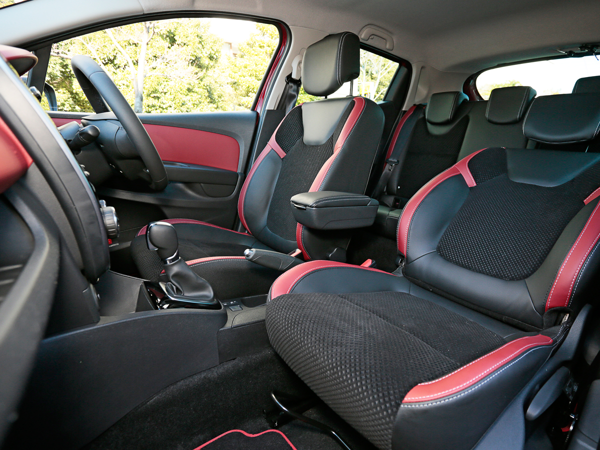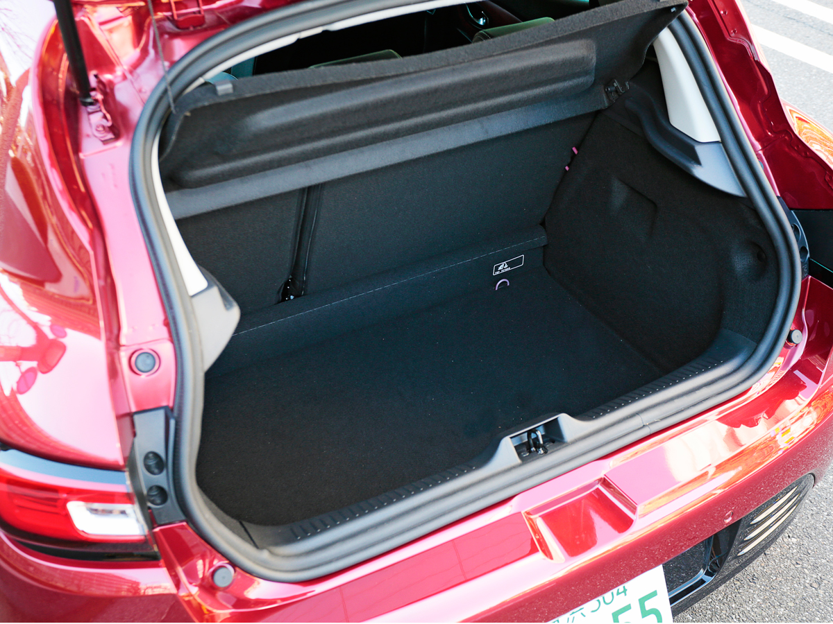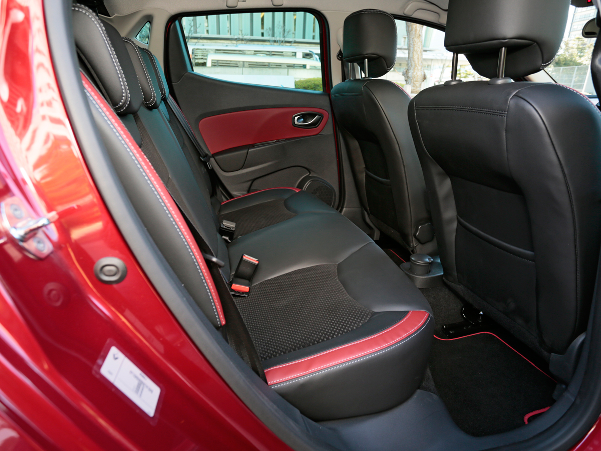 ファブリックとレザーのコンビネーションシートは、かつてのルノー車ほど「スペシャル!」な感じではありませんが、依然としてオシリにやんわりと優しい、座り心地のいいシートです。試乗車のボディカラーに合わせ、ダッシュボード、ドアの内張りほかに、赤のアクセントが反復されます。