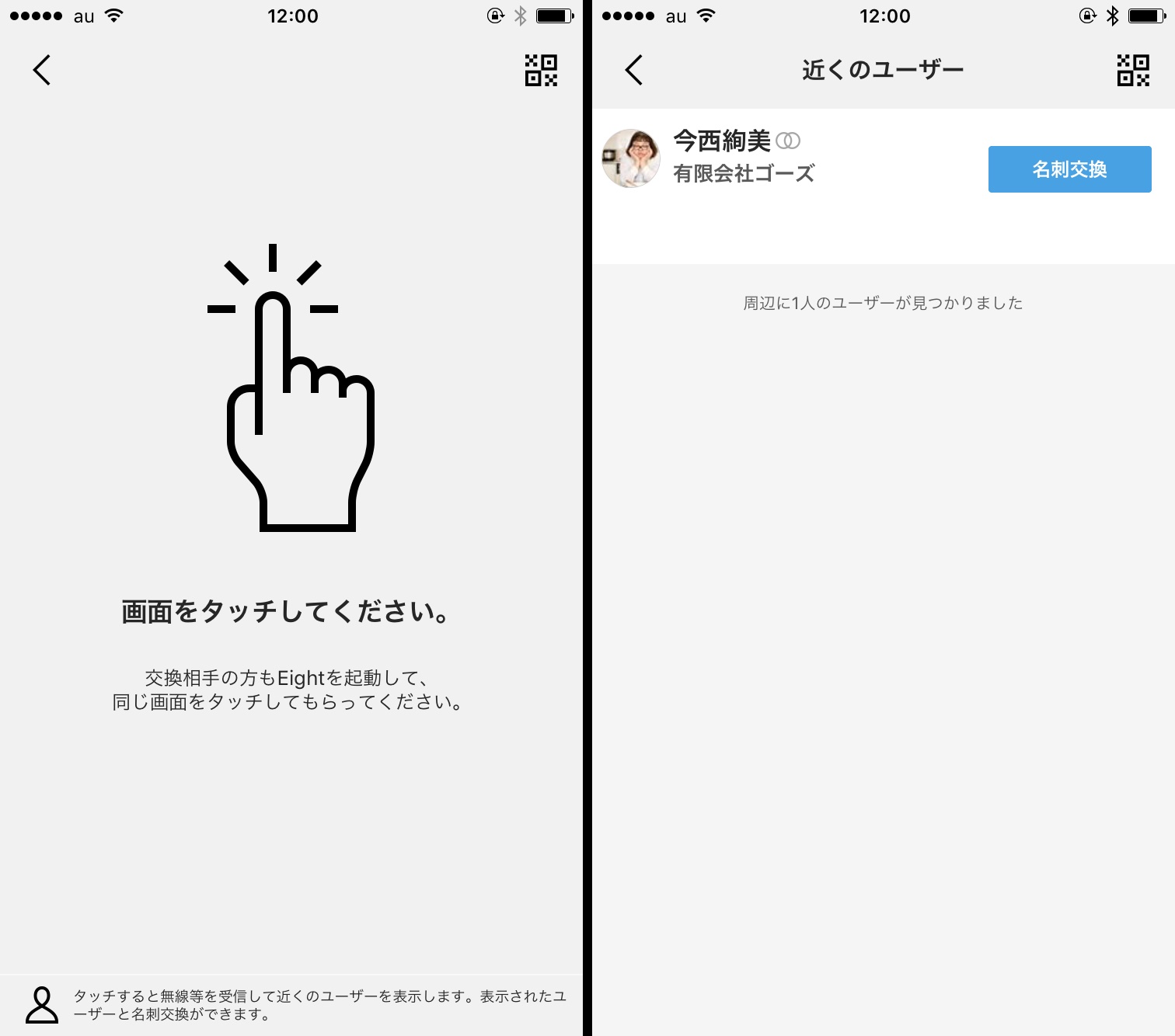 「Eight」はスマホさえあれば、どこでも名刺を撮影・データ化できます。データ化に時間がかかるのは前述の通りですが、「Eight」にはアプリならではの「名刺交換」という機能も搭載されています。これは、アプリに登録した自分の名刺を、Bluetoothを介して相手と交換するというもの。アプリのユーザー同士なら、もらった名刺を撮影する手間を省けるので、限られた時間でサクサク名刺交換をしたい、という人には便利です。