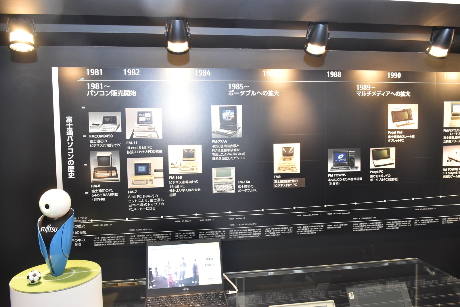 工場見学以外にも、富士通が推し進めている教育、家電連携などさまざまなソリューションのデモも行われたのだが、そのなかでも特に筆者が感銘を受けたのが歴代パソコンの展示だ。