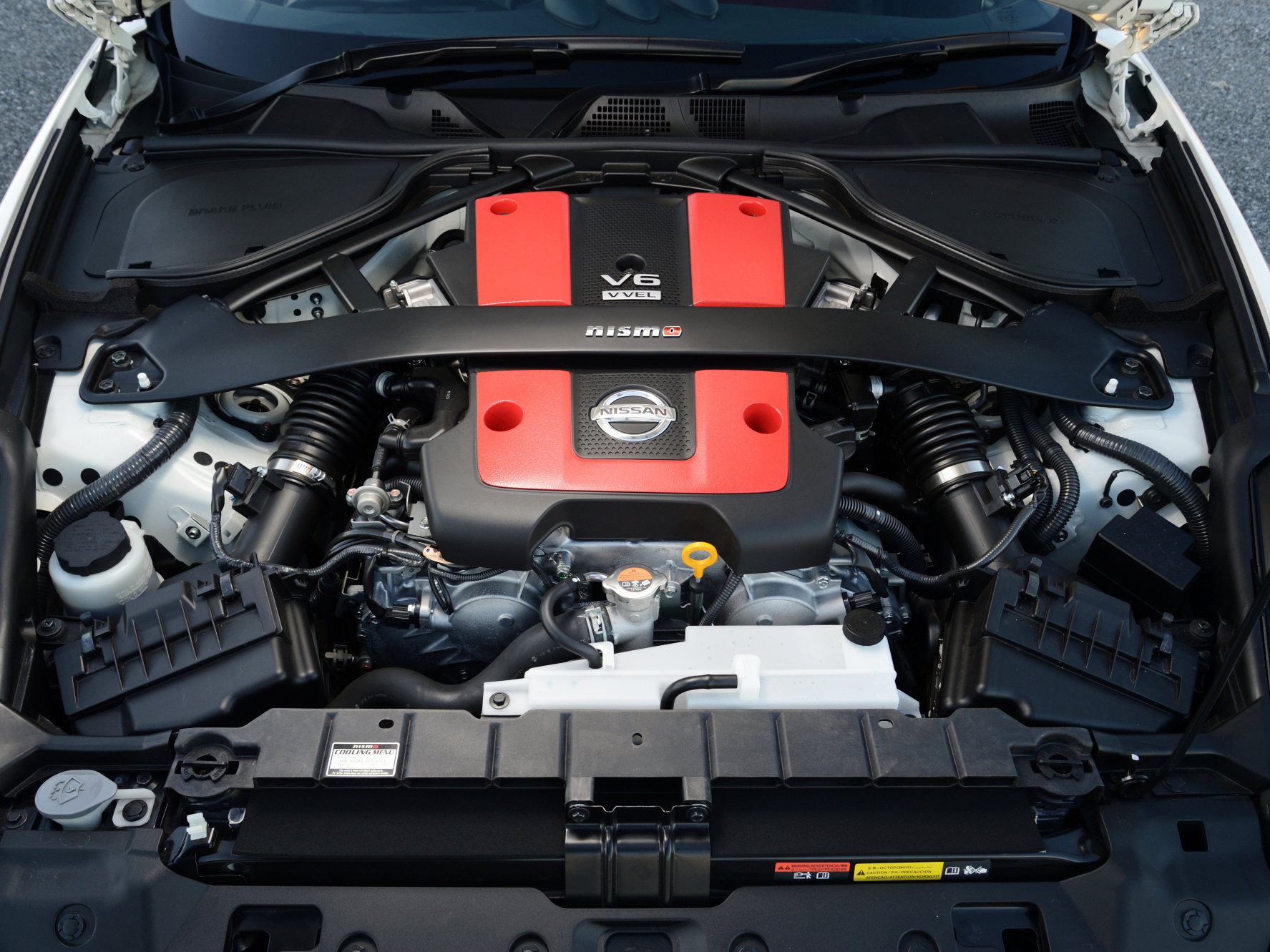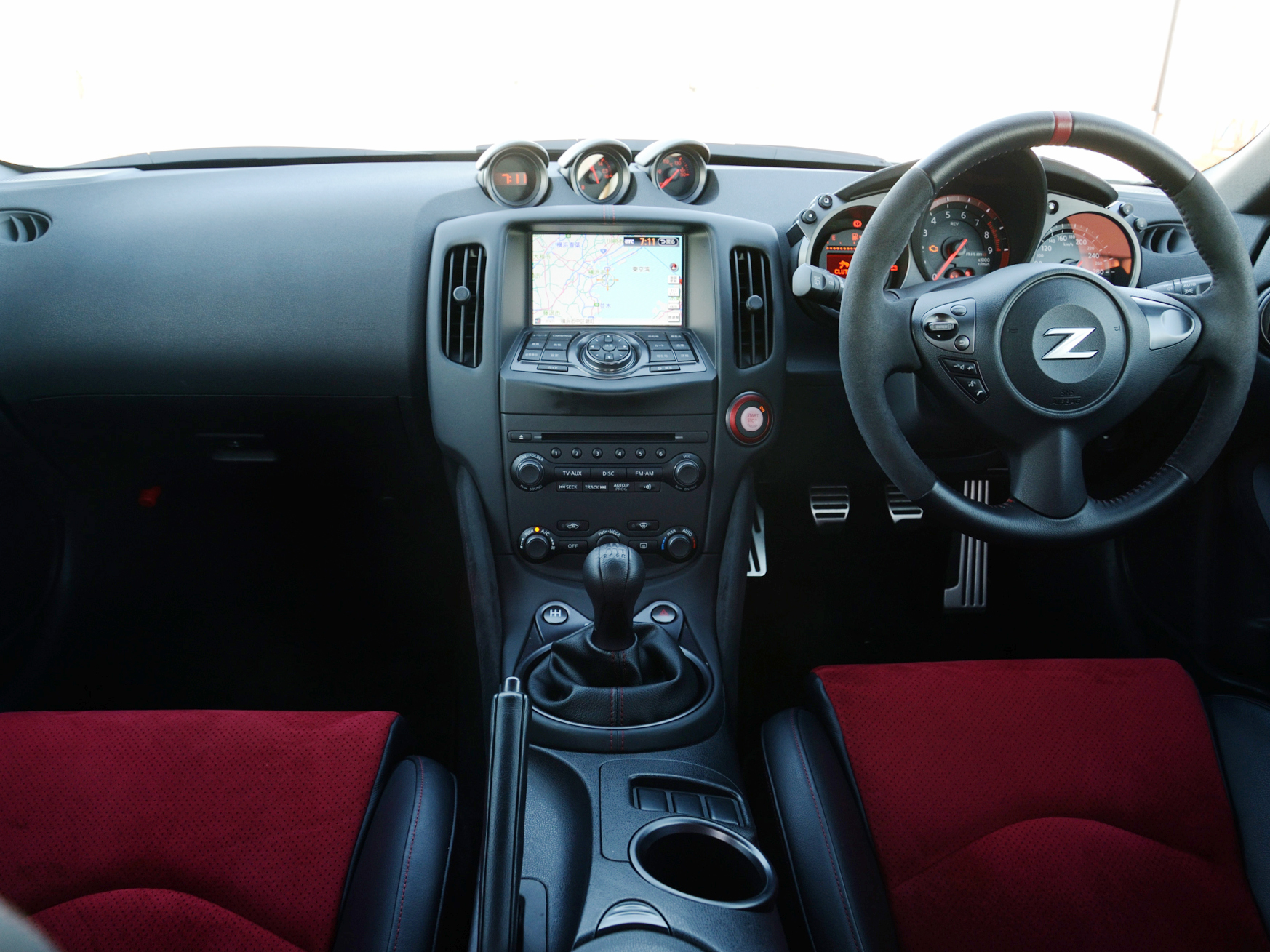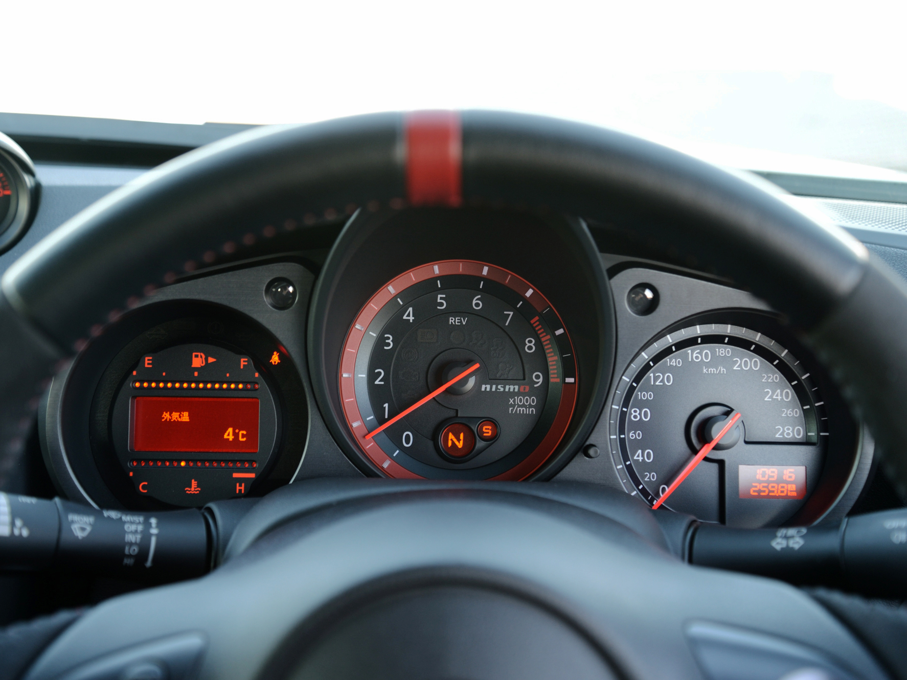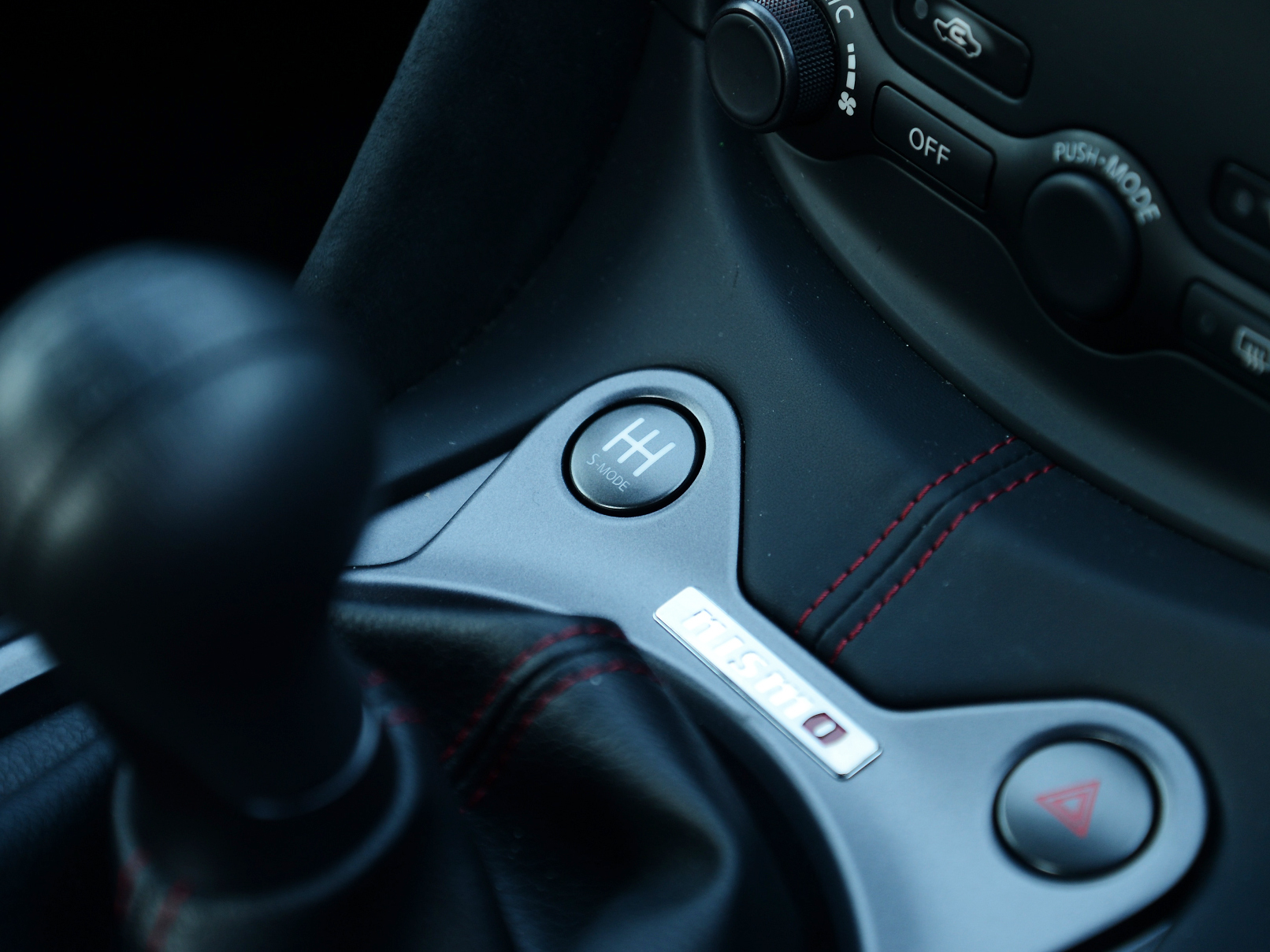 エンジンを始動すべく、クラッチペダルに足を載せると、カッチリと明らかな踏み応え。意を決してスタートボタンと押すと、専用チューンが施され、355馬力を発生する3969ccV型6気筒自然吸気“VQ37VHR”エンジンが「ボンッ!」という低い爆音を伴って目を覚まします。日産のV型エンジンであるVQシリーズは長い歴史があり、サルーンやSUVにも搭載されていますが、この時、VQ37の二面性といいますか、内にもうひとつのキャラクターを秘めていることに気づきました。