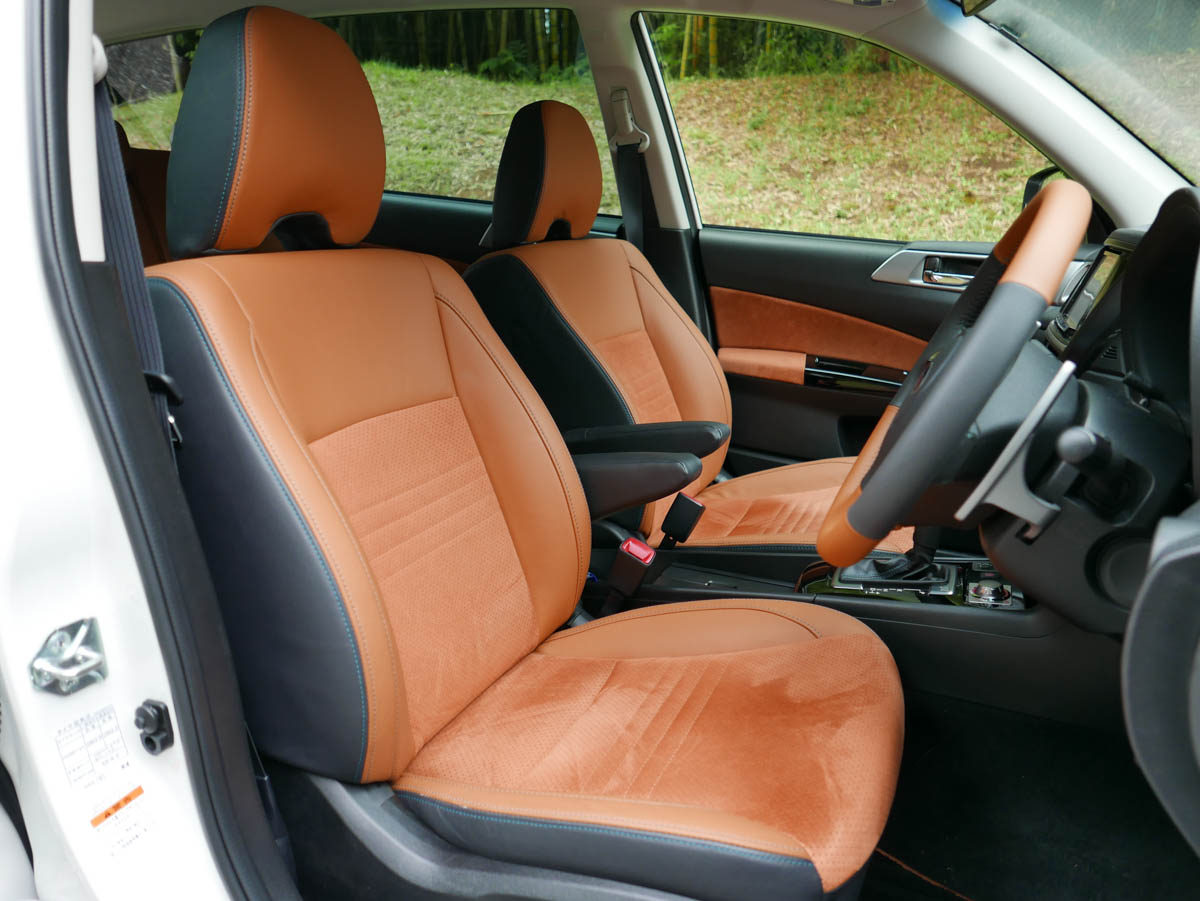 でもクロスオーバー7は、トレッドこそ少し広げてはいますが、無理せずタイヤサイズをキープ。50扁平の、空気がたくさん入ったタイヤによって、乗り味はアタリが柔らかくてリラックスできます。無理に突っ張ったりはしません。オレンジをキーカラーとした、明るい配色の内装の影響もあって、心地良いドライブが楽しめるのです。