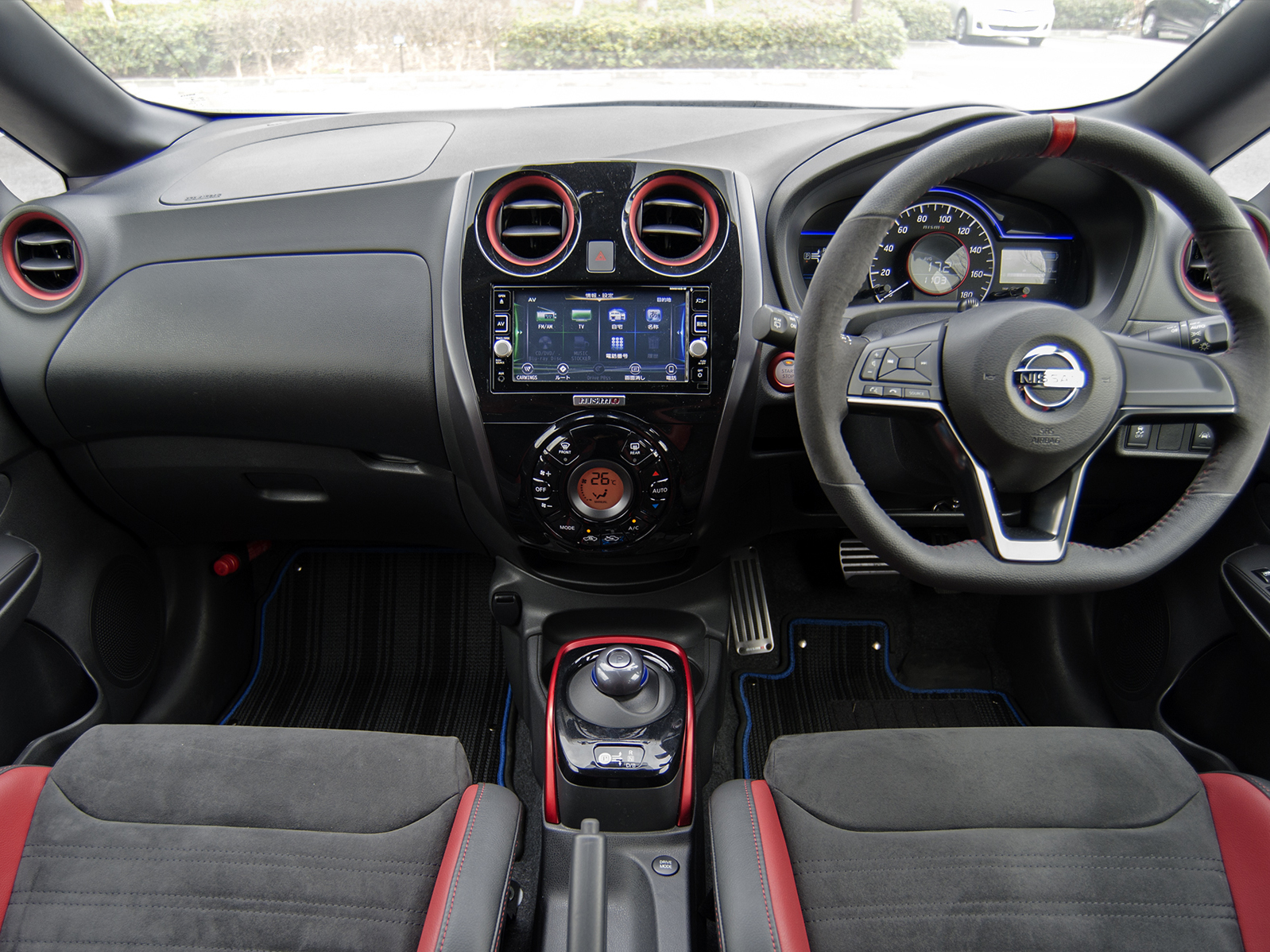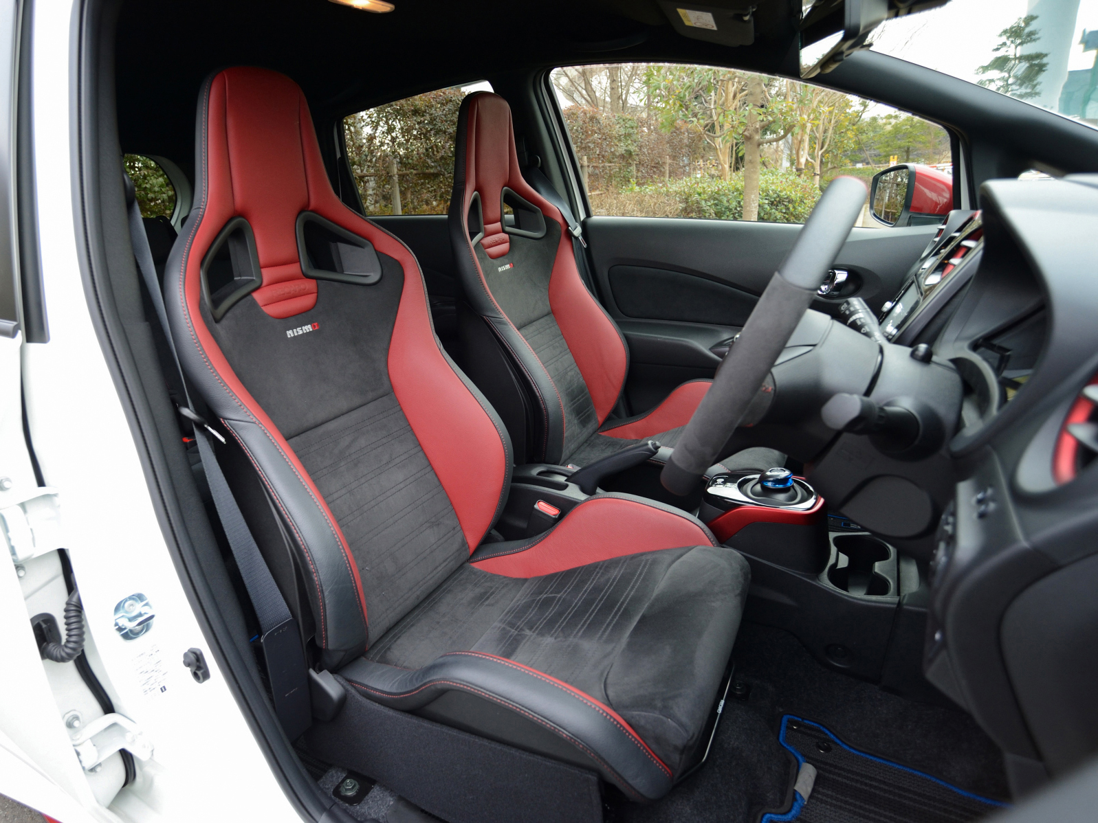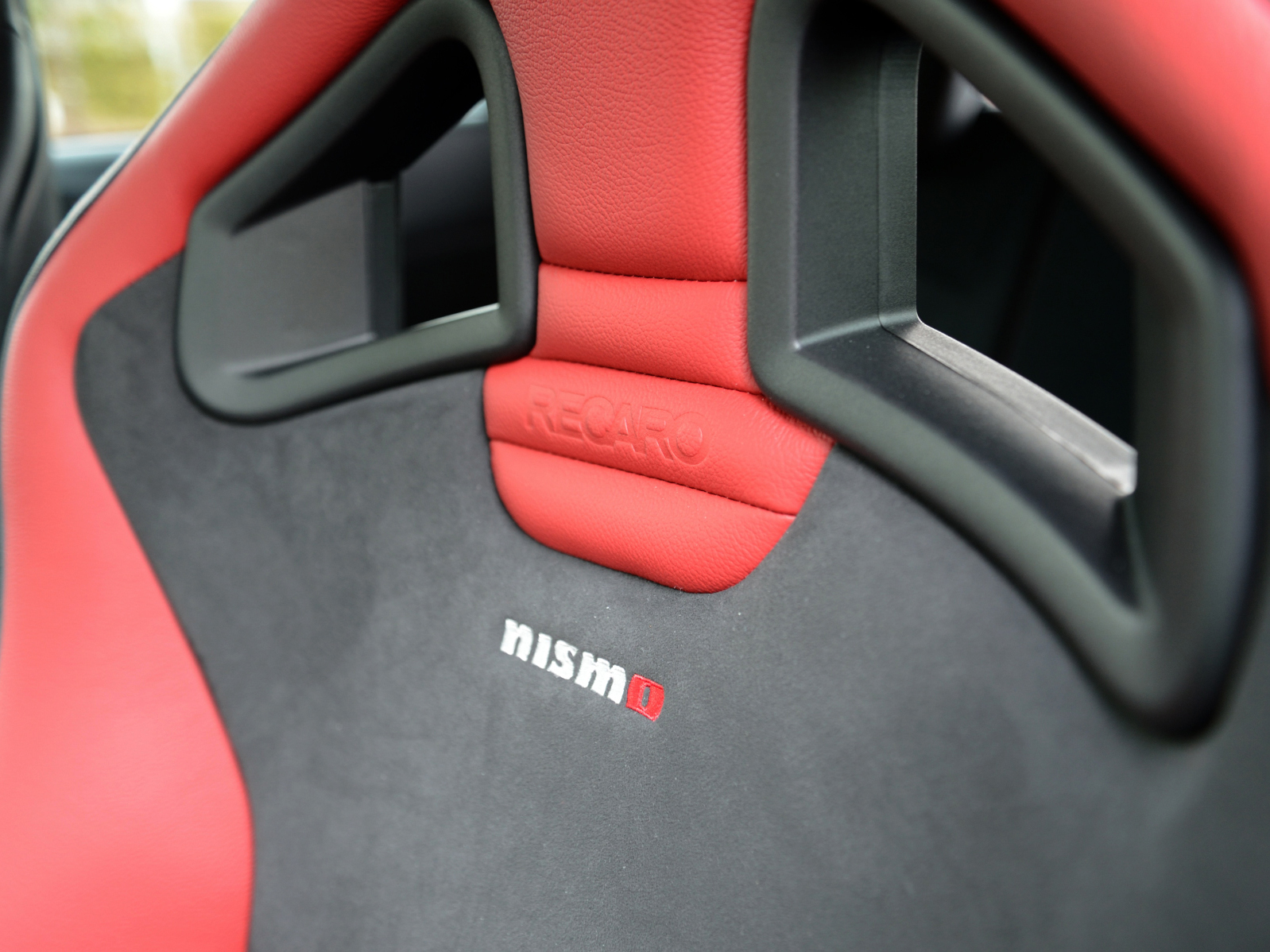 サイドサポートの張り出したスエード調スポーツシートのほか、赤いセンターマークがあしらわれた本革・アルカンターラのステアリング、アルミ製ペダルやフットレストが備わるなど、ニスモのDNAを感じさせる特別パーツがズラリ。さらに、エアコン吹き出し口やメーター中央部のリングなどにレッドの装飾が施され、ドライバーズシートに座るだけでも気分が高まります。