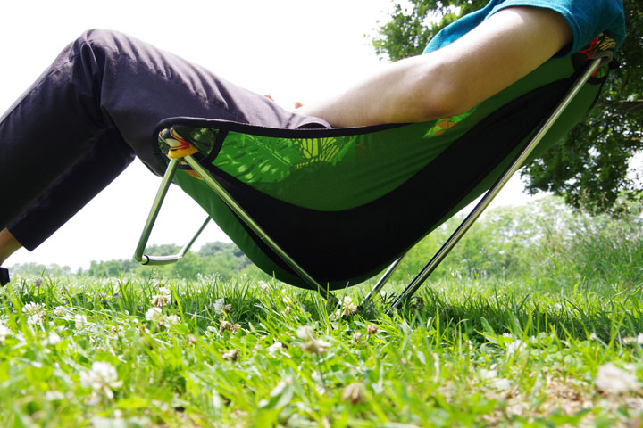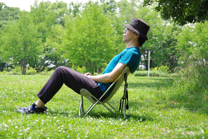 見た目以上に包まれた感じがする座り心地。脚が短い分、より地面の近くまでお尻が下がるので、ちょっとハンモックにも近いような感覚も。また脚の短さは安定感にもつながっています。