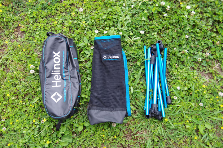 スタッフバッグ(収納袋)を開けると、中にはシート部分とフレームとなるポールが折り畳まれて入っています。ポールには、テントのそれと同様に中にゴムが通っていて、バラバラになることはありません。スタッフバッグ自体はファスナーで大きく開くので、実は片付けるときにすごくラクなんです。これもポイントが高いかも。