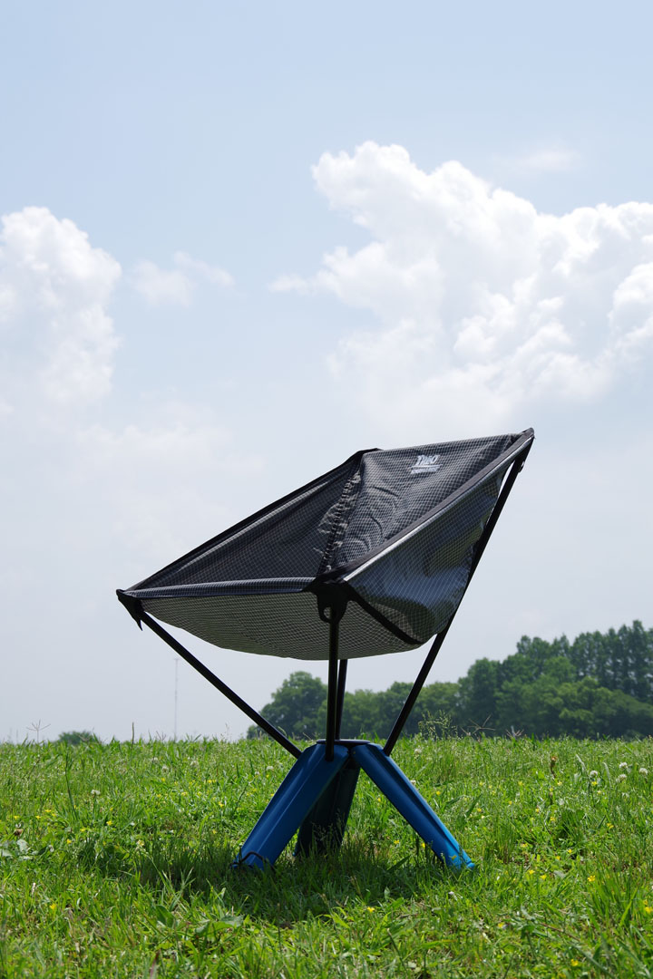 これが完成形。結構な高さになります。収納サイズが最小な分、どうしてもチェア全体としての長さが短めになってしまいますが、ケースを脚に利用するという発想は、アウトドアギアらしくていいですね。