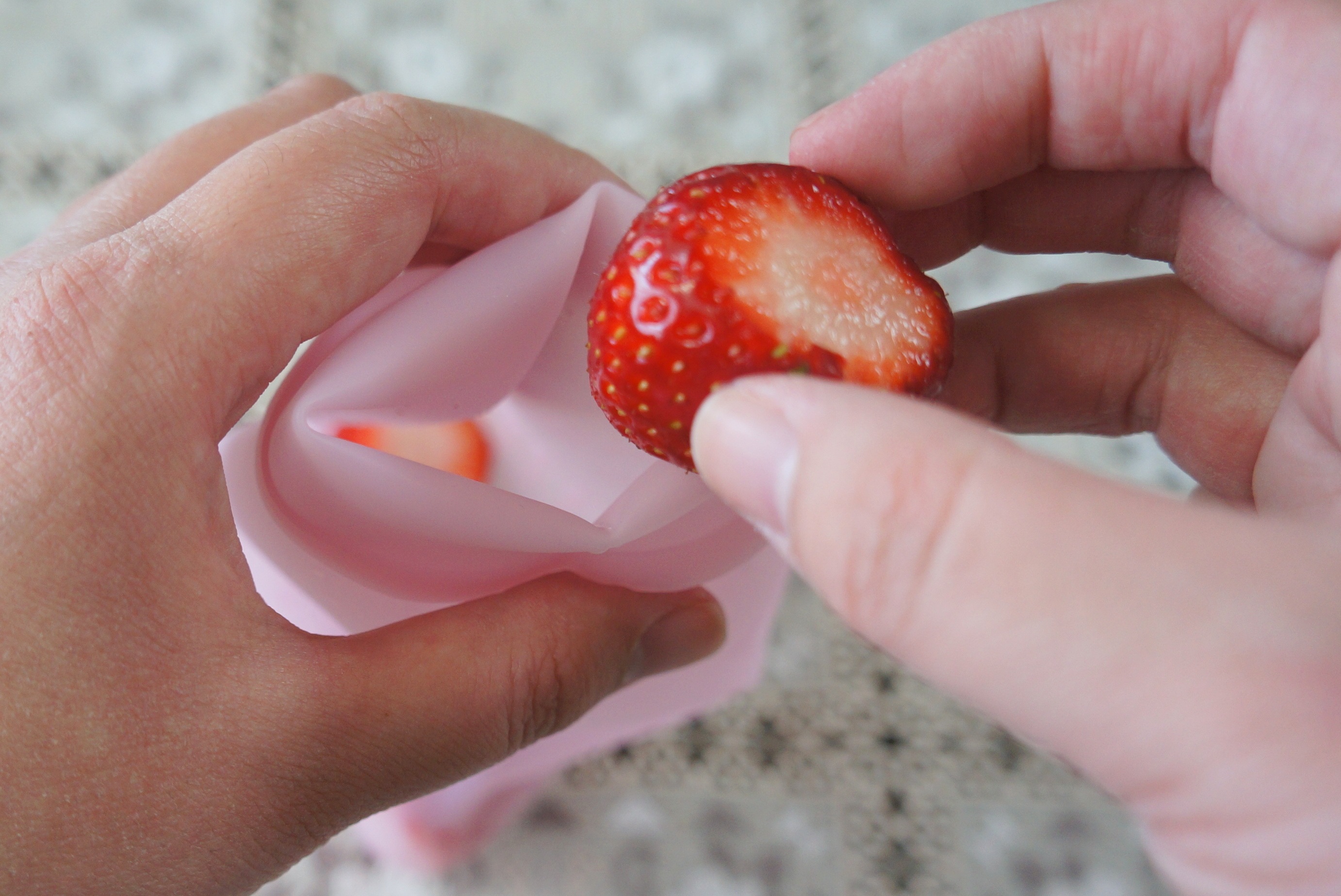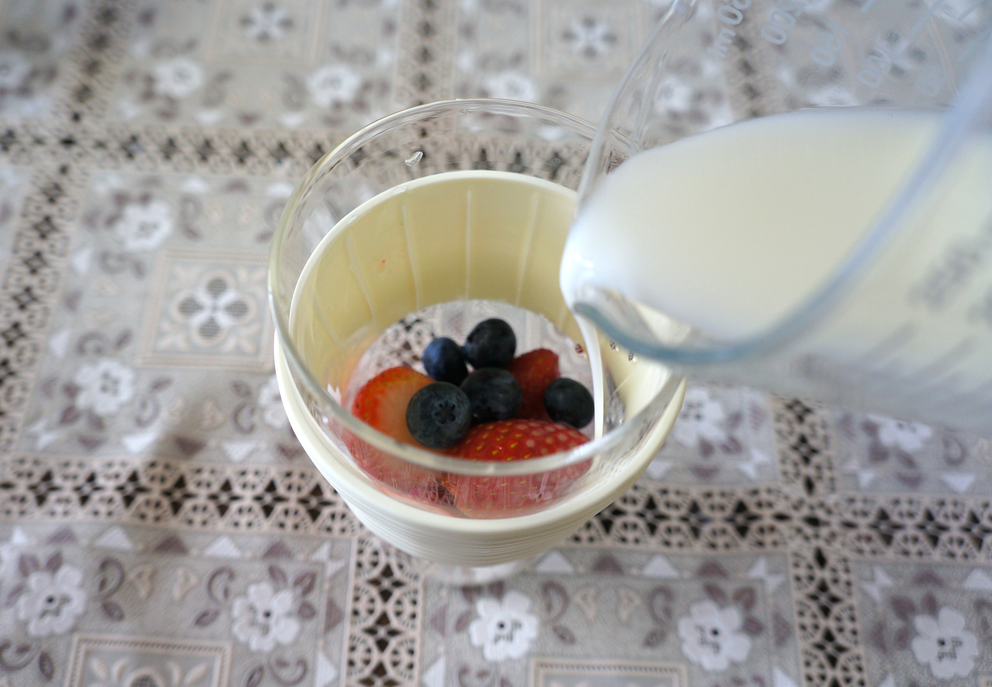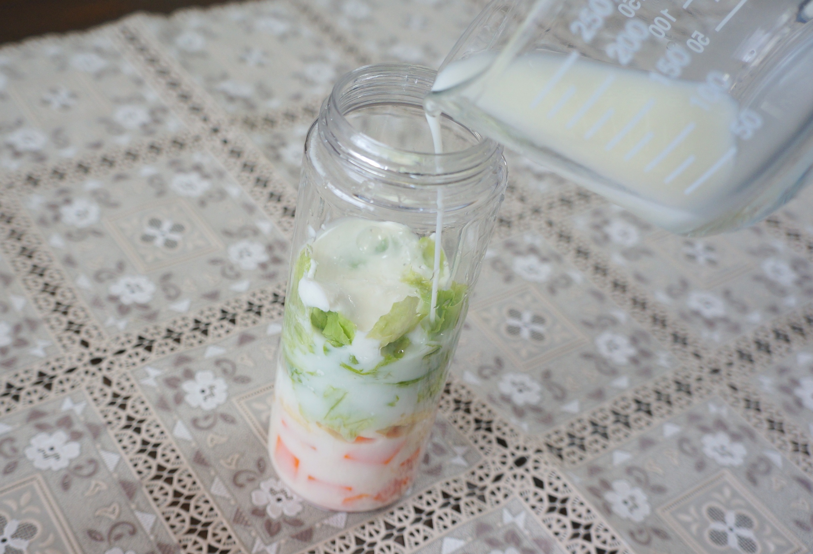 まずは、ボトルに材料を入れます。ニンジンなど水分が少ない固い野菜から順に入れ、最後に牛乳やヨーグルトを投入しましょう。