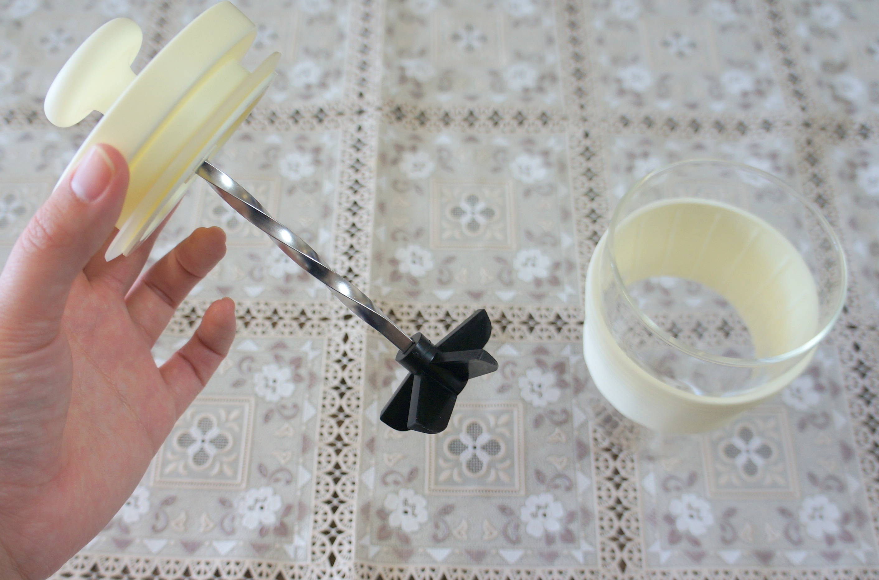 ボトルのキャップを閉めます。キャップ部分にある刃が回転し、中の材料をすり潰す仕組みです。