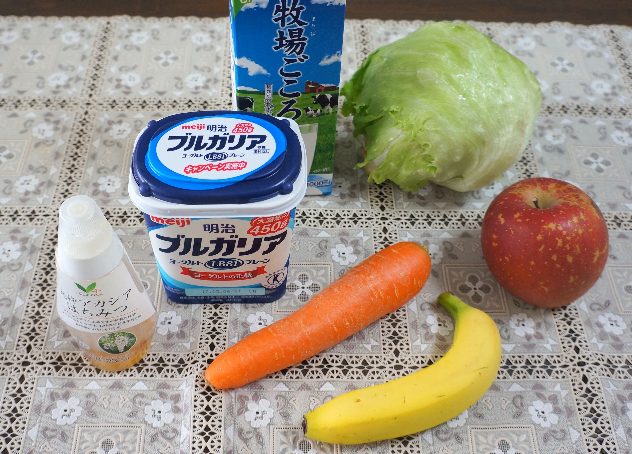 ▲野菜と果物を取り込んだスムージー。ひとり分の材料として、レタス2枚、ニンジン1/2本、バナナ1/2本、リンゴ2~3かけらを使った。ほかに、牛乳100ccとヨーグルト40g、はちみつ適量を使用