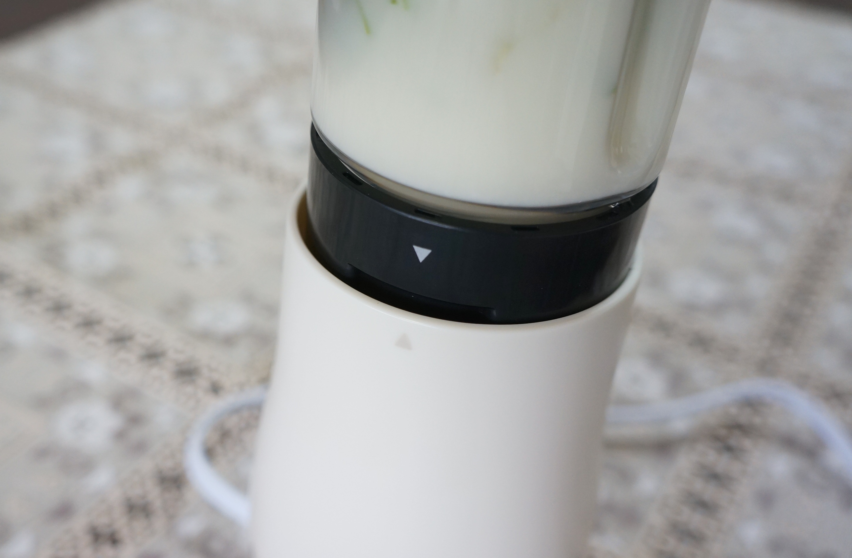 本体にボトルをセットし終えたら、ボトルの底を押します。これにより、ボトルのキャップ部分にある刃が回転し、材料をすり潰します。手を離すと刃の動きが止まるので、材料のすり潰し具合を自分の好みで調整しましょう。