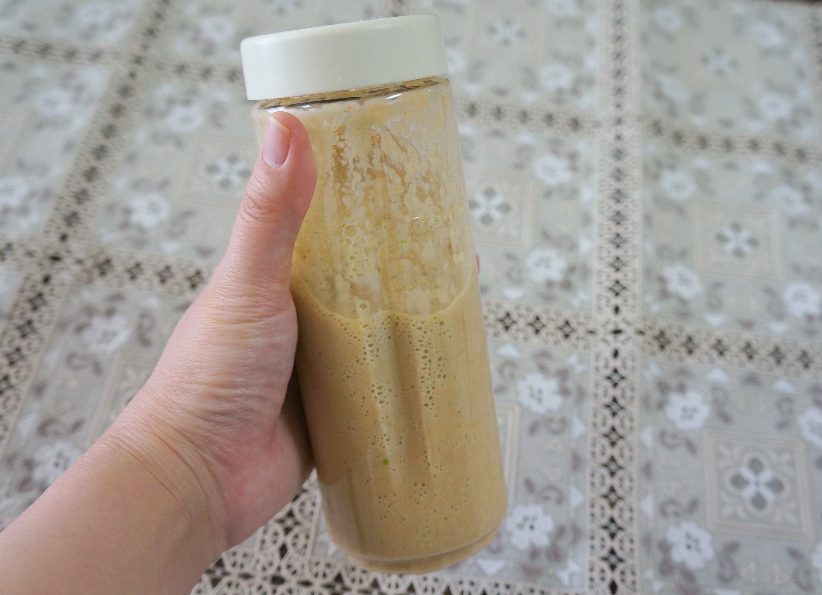 ボトル内の材料が均一にすり潰されていることがわかります。さらりとした飲み心地の中に、野菜や果物の味をしっかり感じられたのが印象的でした。野菜が苦手な人も、果物やはちみつを上手に組み合わせれば、抵抗なく飲めそうです。