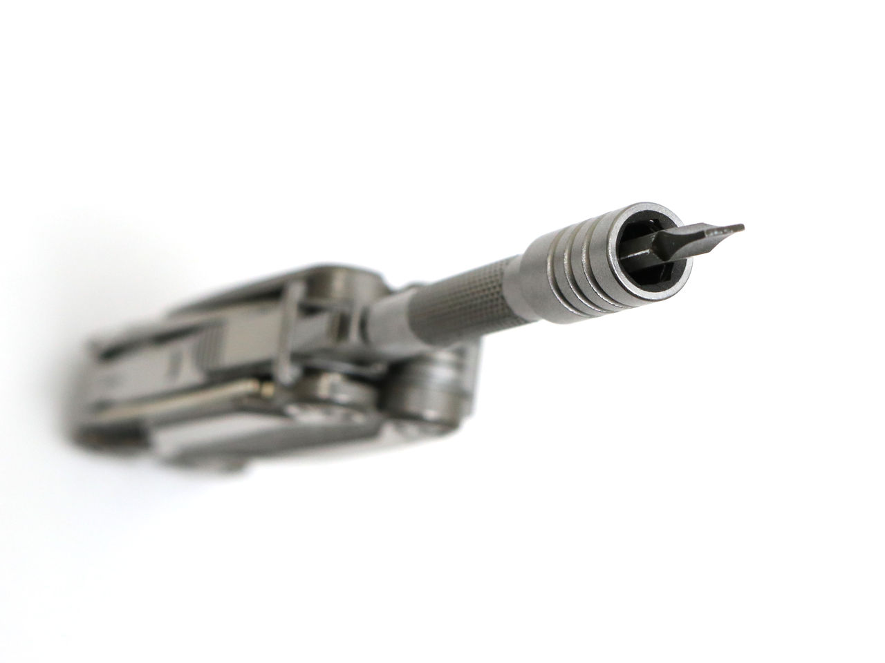 このようにマルチツールのビットキットホルダーに直接差し込み、さらに先端にビットキットを装着するだけ。このエクステンダーの方は、通常の1/4インチ規格のビットがそのまま入る設計になっていて、手持ちのドライバービットをそのまま使えます。