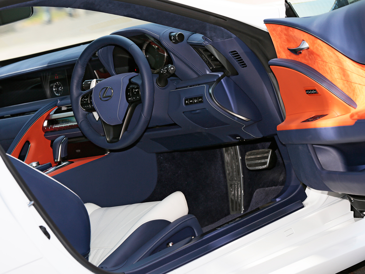 最初に試乗したのは「LC500h Lパッケージ」(1350万円)。ハイブリッドモデルの豪華内装バージョンです。“ガラスパノラマルーフ”が与えられ、贅沢なセミアニリン本革シート(ベンチレーション&ヒーター付き)がおごられます。足もとは、オプションの21インチ!…というか、標準でも20インチのタイヤ&ホイールが与えられることに、ちょっと驚きます。