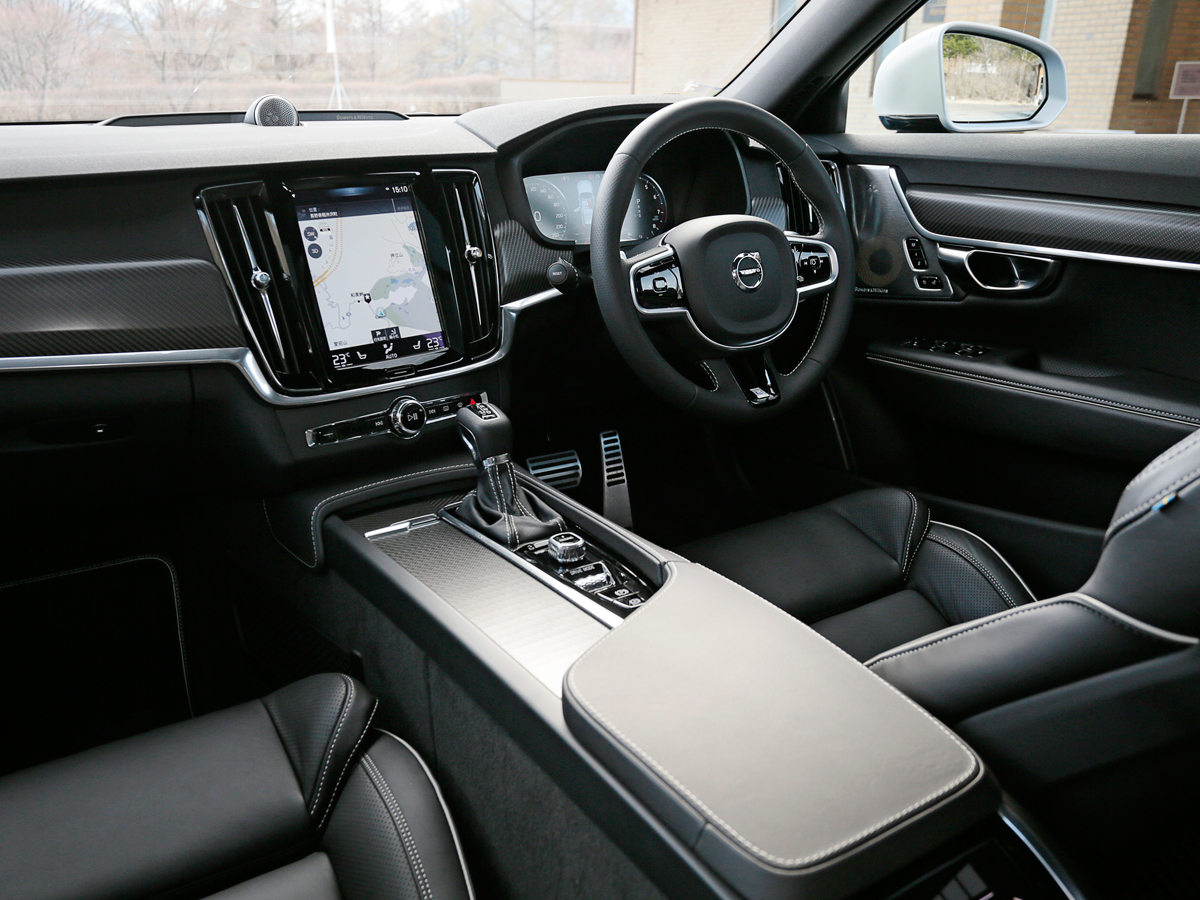 さて、V90のRデザインです。試乗したT6のパワーユニットは、2リッター直4ターボ+スーパーチャージャー(320馬力/40.8kg-m)。2リッターターボを積む「T5」(664万円)と、2リッターターボ+スーパーチャージャー+電気モーターの「T8 ツインエンジン」(899万円)の間に位置する中堅グレードです。