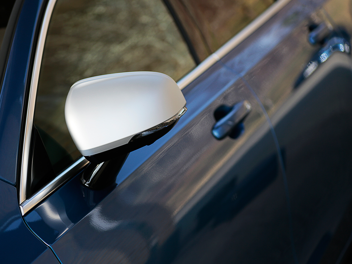 Rデザインの外観をチェックしてみましょう。ワイド感を強調した専用グリル、スポーティなルックスの前後バンパーはお約束として、意外に効いているのが、前後ドア部と荷室部のサイドウインドウをグルリと囲むウインドウトリムが、シルクメタルとなっている点。マットシルバーにペイントされたサイドミラーと呼応して、クールさを加速させます。