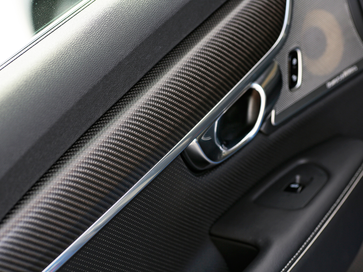 ドアを開ければ「黒一色!?」と思わせる室内。大きなセンターディスプレイを囲むグロスブラックのパネル。そして、カーボンパネル。ところどころに使われるメタルパーツが、ググッと雰囲気を引き締める。これまでのボルボ車とは無縁だった“艶”を感じさせる、というのは、いい過ぎでしょうか。